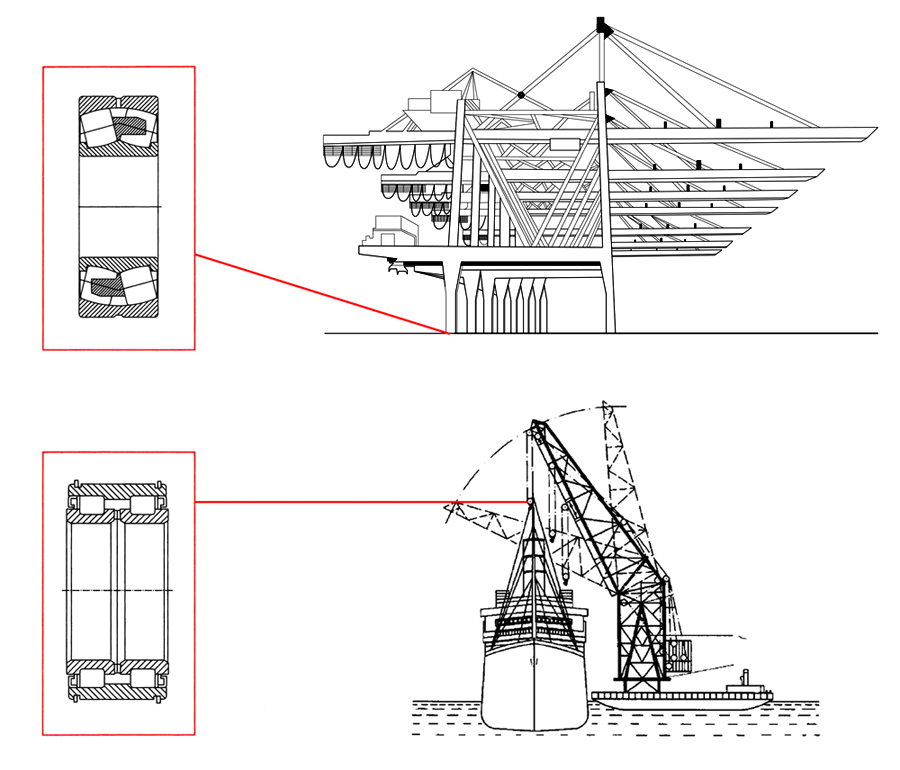 起重運(yùn)輸機(jī)械的工作特點(diǎn)是間歇性運(yùn)動(dòng),各機(jī)械經(jīng)常處于啟動(dòng)、制動(dòng)和正反向運(yùn)轉(zhuǎn)的工作狀態(tài),其運(yùn)行速度雖然不高,但經(jīng)常承載重載,且長(zhǎng)期在粉塵或海水潮濕腐蝕等惡劣環(huán)境下連續(xù)工作,要求設(shè)備必須具有高效、連續(xù)、穩(wěn)定、可靠、易維護(hù)和長(zhǎng)壽命等特點(diǎn),相應(yīng)對(duì)配套軸承提出低速、重載、高可靠性及長(zhǎng)壽命的要求。目前軸承主要應(yīng)用于齒輪箱、行走機(jī)構(gòu)、起升機(jī)構(gòu)、變幅機(jī)構(gòu)、回轉(zhuǎn)機(jī)構(gòu)等。