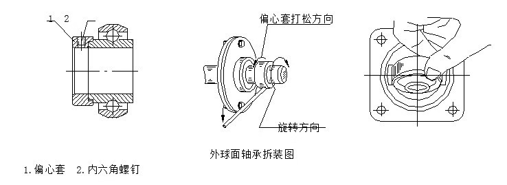 1. 軸承上帶有偏心套時(shí)先擰松偏心套上鎖緊螺釘,然后用小鐵棍插入或頂著偏心套上的沉孔,逆著軸的旋轉(zhuǎn)方向打松偏心套(見圖)。